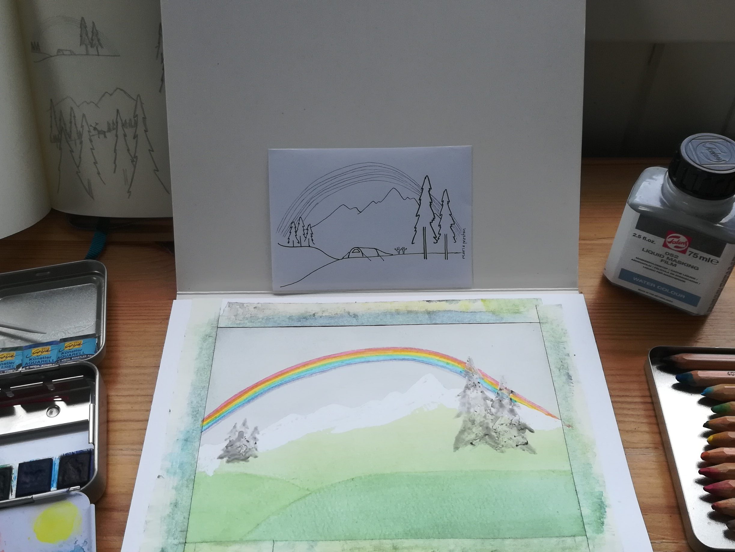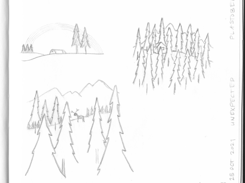 I featured this scene in a pencil sketch for the Plastober 2021 drawing prompt Unexpected. Further inspiration for this illustration came from recent summer rainbow sightings in Folldal, Norway and the dual-colour prompt Leaf Green & Cool Grey II.