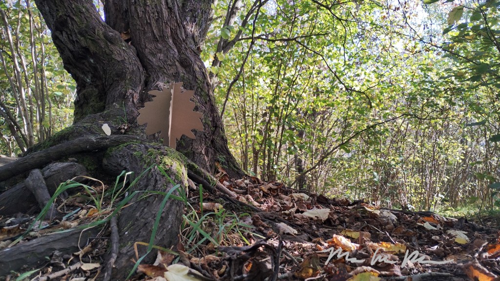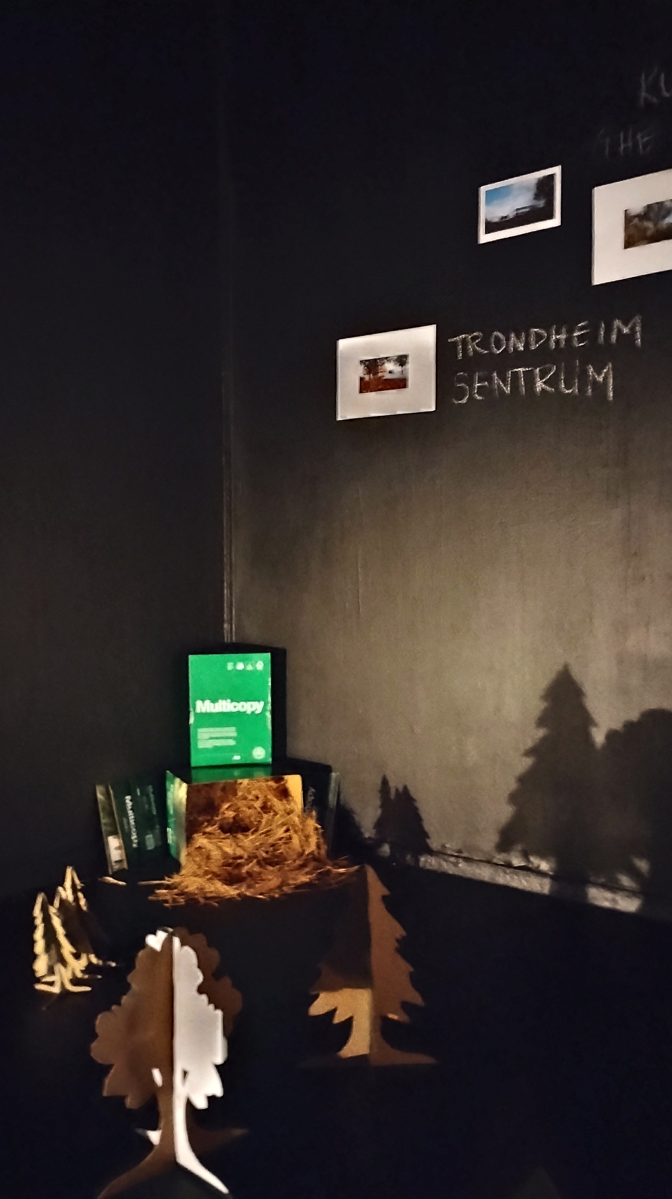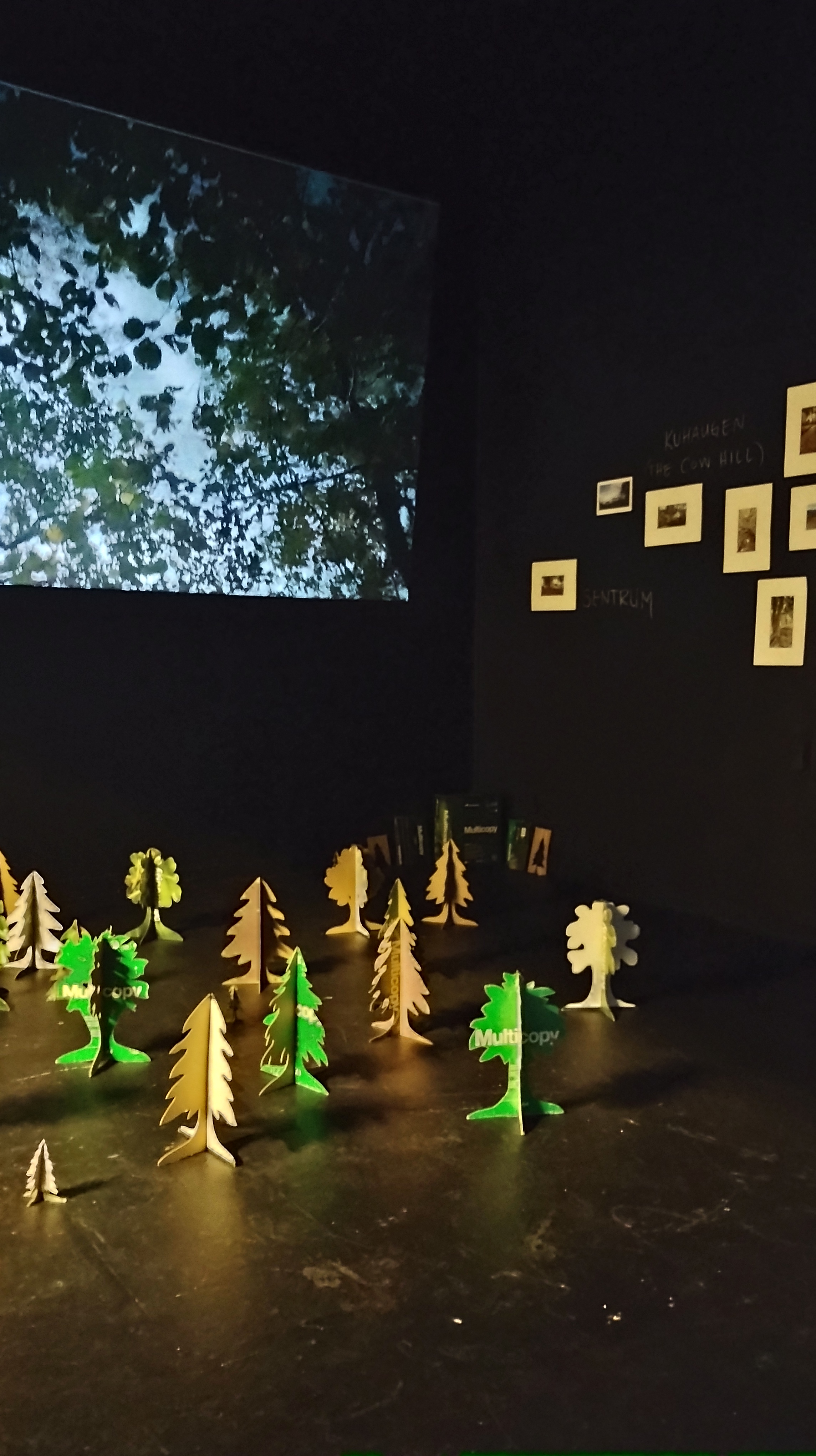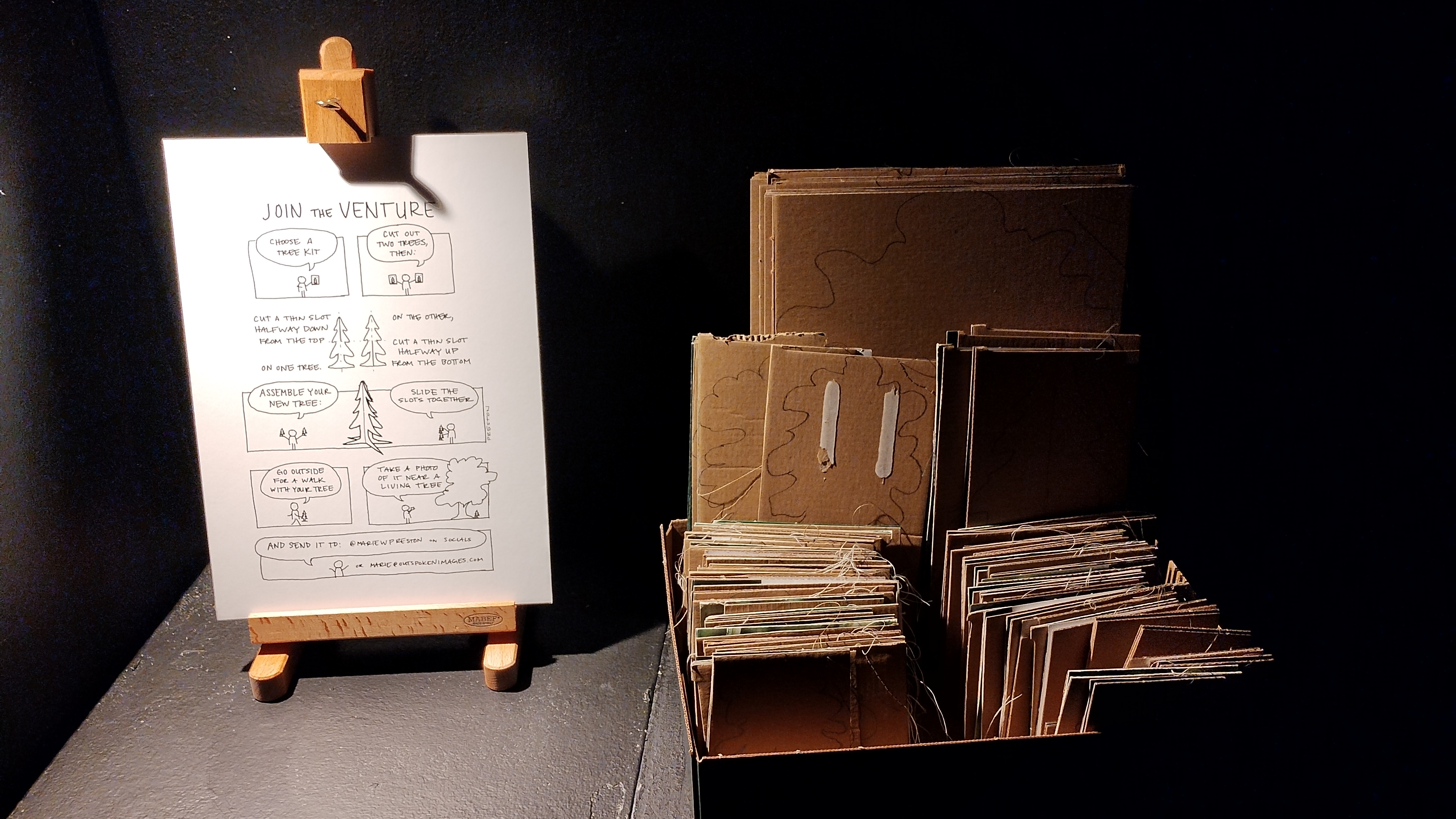 Cardboard trees from copypaper boxes, photographs of cardboard trees outdoors with live trees, cardboard tree kits, leftover pieces from tree cutting, copypaper boxes, pine needles, video installation